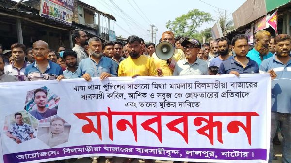 নাটোরের লালপুরে নিজ বাড়ি থেকে ৩ ব্যবসায়ীকে ডিবি পরিচয়ে তুলে নিয়ে রাজশাহীর বাঘা থানার খানপুর থেকে আটক দেখিয়ে পুলিশের সাজানো মামলার প্রতিবাদ ও মুক্তির দাবিতে মানববন্ধন করেছে স্থানীয় ব্যবসায়ীরা। জানা