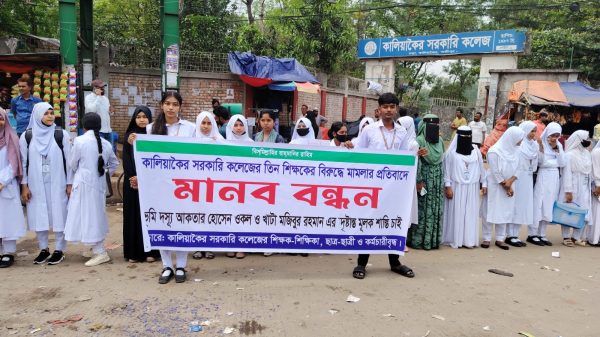 কালিয়াকৈর সরকারি কলেজের তিন শিক্ষকের বিরুদ্ধে দায়েরকৃত মামলা প্রত্যাহারের দাবিতে মানববন্ধন ও বিক্ষোভ কর্মসূচি পালন করেছেন কলেজের শিক্ষক, শিক্ষার্থী ও কর্মচারীরা। রবিবার সকালে ঢাকা-টাঙ্গাইল মহাসড়কের চন্দ্রা এলাকায় অবস্থিত কালিয়াকৈর সরকারি