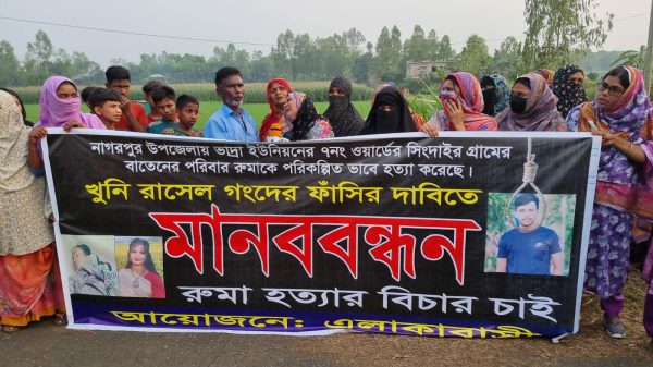 টাঙ্গাইলের নাগরপুর উপজেলার ভাদ্রা ইউনিয়নের কোদালিয়া গ্রামের শতশত নারী পুরুষ রুমা’র হত্যাকারী রাসেলের ফাঁশির দাবিতে মানববন্ধন করেছে। গতকাল গৃহবধূ রুমা’র রহস্যজনক মৃত্যু কে হত্যা দাবি করে, হত্যাকারীদের বিচারের দাবিতে আজ
